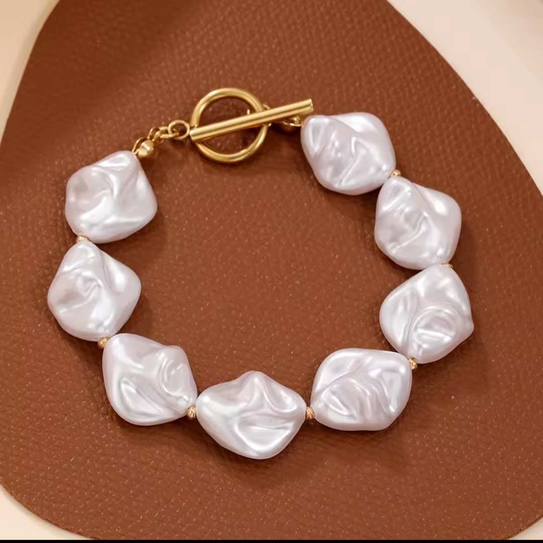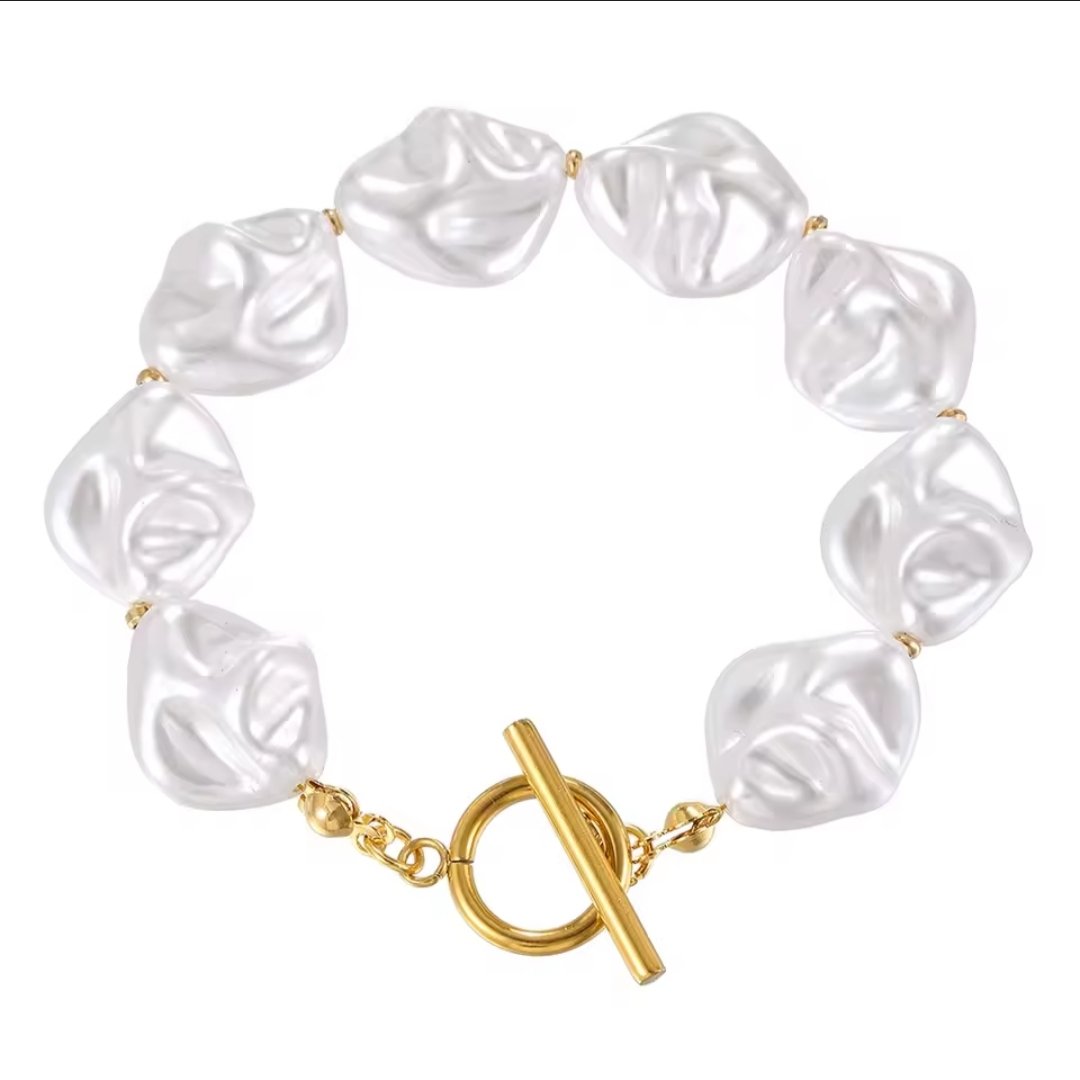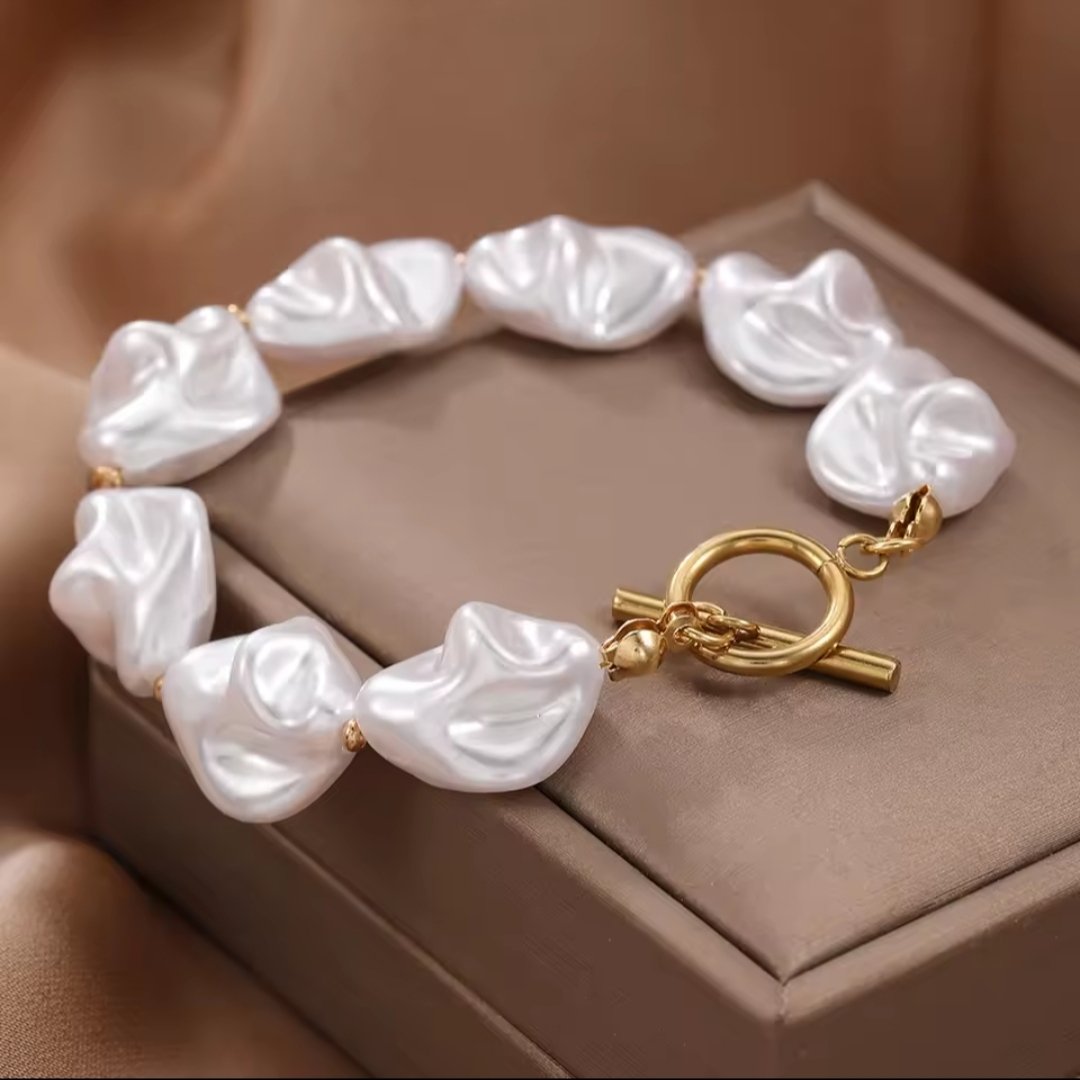Διαθέτει εντυπωσιακές μπαρόκ (ακανόνιστες) περλίτσες, που προσθέτουν φυσική λάμψη και ιδιαίτερο χαρακτήρα, ενώ το χρυσό μεταλλικό κούμπωμα τύπου Τ δίνει μια πινελιά πολυτέλειας και μοντέρνου design.