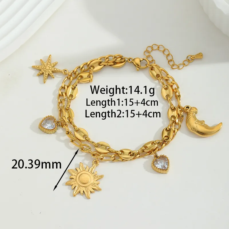 Το διπλό του layered σχέδιο με τα κρεμαστά charms — ήλιο, φεγγάρι και καρδιά με ζιρκόν — αντιπροσωπεύει ισορροπία, αρμονία και θηλυκή ενέργεια, κάνοντάς το το απόλυτο everyday κόσμημα για γυναίκες που αγαπούν τα συμβολικά αξεσουάρ.