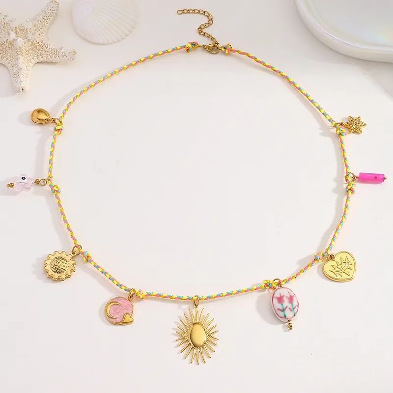 Αναβαθμίστε το στυλ σας με αυτό το χρυσό κολιέ με charms, που συνδυάζει την κομψότητα με την παιχνιδιάρικη διάθεση. Το επιχρυσωμένο φινίρισμα σε 18Κ χρυσό χαρίζει πολυτέλεια και λάμψη, ενώ τα μοναδικά κρεμαστά στοιχεία – όπως ήλιος, καρδιά, λουλούδι και πολύχρωμες λεπτομέρειες – δίνουν ζωντάνια και προσωπικότητα σε κάθε σας εμφάνιση.