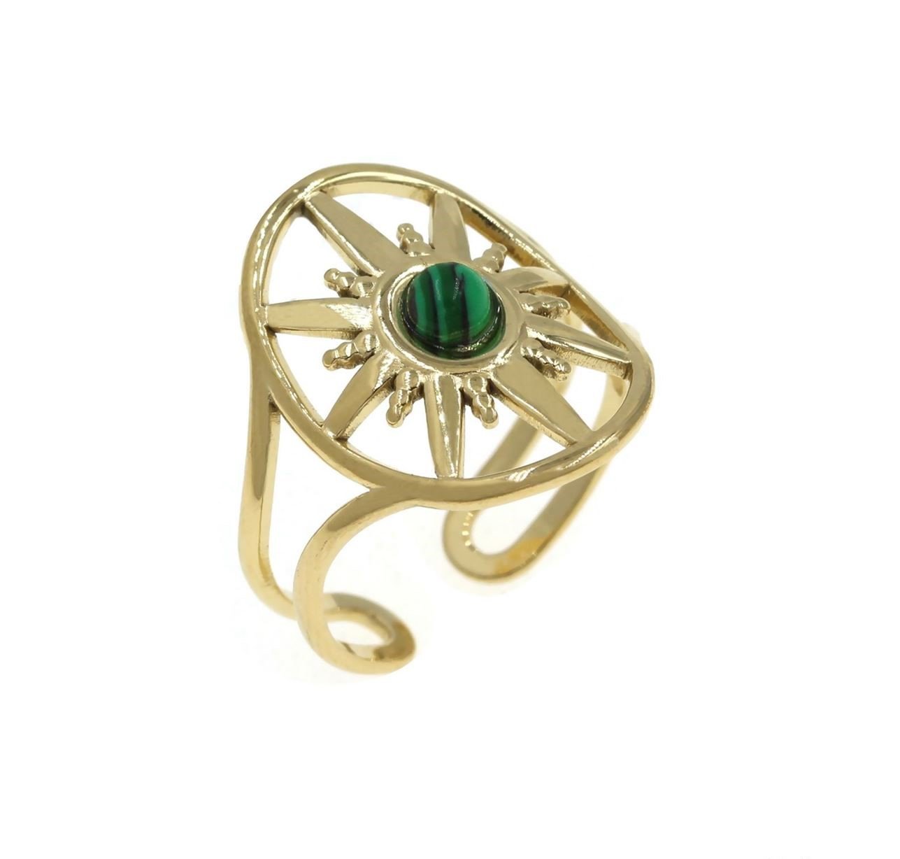 Το δαχτυλίδι “Ακτίνα Πράσινου Ήλιου” είναι ένα εντυπωσιακό κόσμημα που ακτινοβολεί φως και δυναμισμό. Κατασκευασμένο από ανοξείδωτο ατσάλι επιχρυσωμένο 18Κ, προσφέρει διαχρονική λάμψη και ανθεκτικότητα στη φθορά.