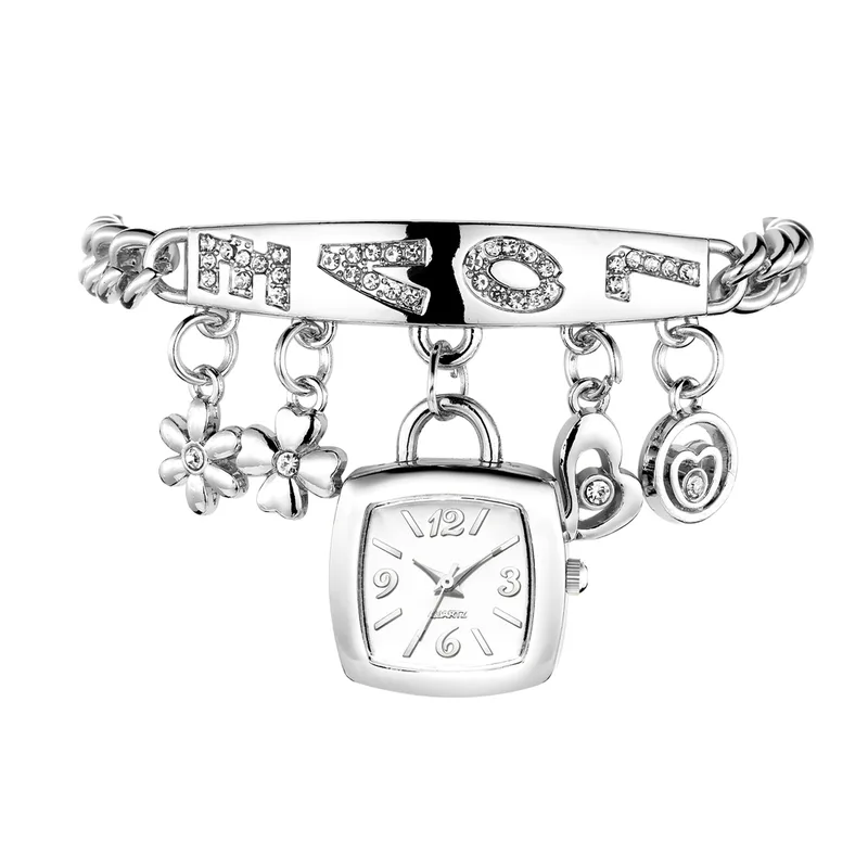 Μοντέρνο γυναικείο ρολόι Quartz από ανοξείδωτο ατσάλι, σε σχέδιο βραχιολιού με κρεμαστά charms και λευκά ζιρκόν. Ιδανικό για casual και elegant εμφανίσεις.