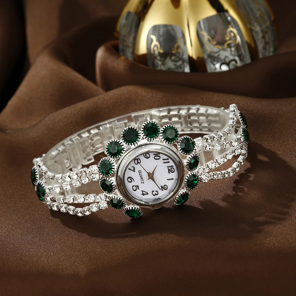 Εντυπωσιακό 5κομμάτιο γυναικείο σετ “Άνεμος” από ανοξείδωτο ατσάλι με πράσινο ζιρκόν, που περιλαμβάνει ρολόι, βραχιόλι, κολιέ, σκουλαρίκια και δαχτυλίδι. Ιδανικό για κομψές και λαμπερές εμφανίσεις.