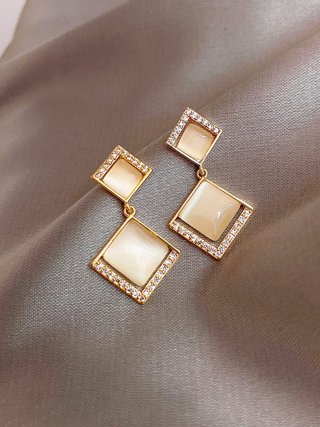Κομψά επιχρυσωμένα σκουλαρίκια σε γεωμετρικό σχέδιο, με λαμπερές πέτρες ζιργκόν και λευκές λεπτομέρειες.